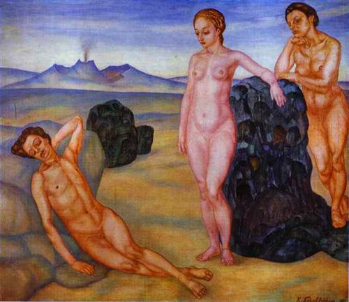 Kuzma Petrov-Vodkin(1878-1939) was a Russian, later Soviet, painter and writer. He was first exposed to art as a child, when he took a few lessons from a local sign maker and icon painter. After secondary school, however, he wanted to join a railroad college, abandoning the artist life. He failed the entrance exams to the college, however, and instead began “Art Classes of Fedor Burov,” in his late teens. After the death of Burov two years later, Petrov-Vodkin took odd jobs painting in the city. Through his jobs and with his mother’s help, he was able to get an invitation to study in St. Petersburg, from 1895 to 1897. In art school, he later moved to Moscow and then Munich, graduating in1904.